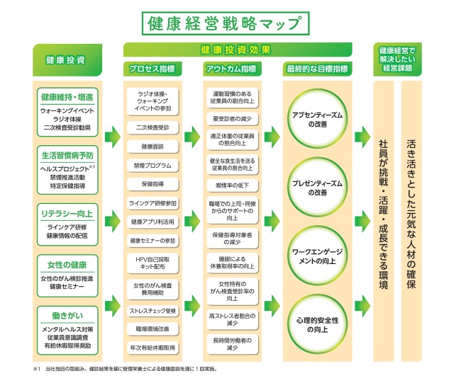 目指し、健康経営戦略マップを基に指標を定め、それに基づいて健康施策を実施しています。社員一人ひとりが